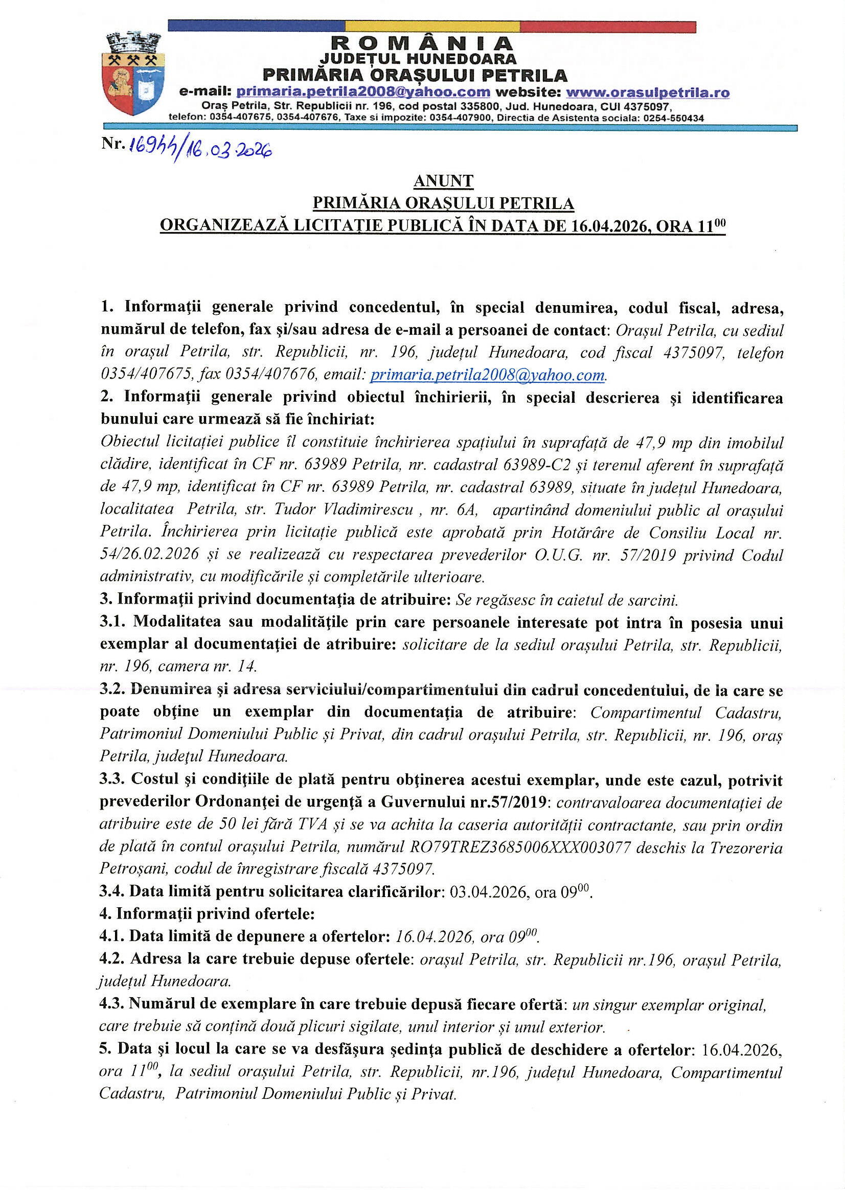 Licitatie publica 16.04.2026, ora 11.00