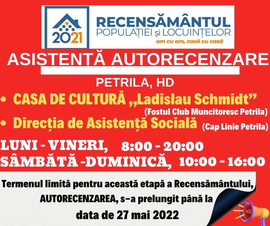 Anunt angajare DHSAnunț dezbatere publică - P.H. NR. 25 din 24.02.2022Anunţ public pentru dezbaterea publică Anunt de participare privind achizitia de servicii sociale de asistenta la domiciliu pentru varstniciAnunt de participare privind achizitia de servicii sociale de asistenta de tip centru de zi pentru copiiAnunț privind înscrierea în lista candidaților pentru personalul de recensământ în vederea prestării serviciilor aferente RPL2021 în teritoriuChestionar Hotarare privind stabilirea taxelor si impozitelor locale pe anul 2022Anunt Registru AgricolHotarare privind stabilirea taxelor de inchiriere si concesiune pe anul 2022Anunt Registru Agricol - pasune disponibilaAnunt autorecenzare asistataANUNT COLECTARE DESEURI PERICULOASEANUNT COLECTARE DESEURI Anunt - Serviciul de Taxe si Impozite LocaleAnunt plati online - Serviciul de Taxe si Impozite LocaleAnunt Registru AgricolAnunt DASPrelungire termen autorecenzareDispozitie comisie paritaraPrelungire termen recensamantColectare Primăria orașului Petrila va aduce la cunoștință ca in data de 04.06.2022 se va desfășura Campania de colectare a deșeurilor abandonate de pe domeniul public al UAT PetrilaDispozitie comisie paritara 21.06.2022ANUNT COLECTIV 21/06/2022Masuri caniculaANUNT COLECTIV 23/06/2022TELEMEDICINA 16-17 august 2022Expozitie de ovine - 4 septembrie 2022Programul anual al finantarilor nerambursabilePETRILA RECICLEAZAImpreuna facem muntii curatiANUNT DEZBATEREAnunt important pentru solicitantii de locuinteRezultat selectare dosareAnunt incalzireInformareAnunt DAS - actele necesare pentru incalzire - actualizate si cuantumuriANUNT COLECTIV 01/11/2022ANUNT COLECTIV 08/11/2022Campanie voluminoase - sambata 12.11.2022Anunt ardere deseuriANUNT COLECTIV 15/11/2022ANUNT COLECTIV 24/11/2022ANUNT COLECTIV 28/11/2022ANUNT DAS - Distribuire pachete ajutoareANUNT COLECTIV 14/12/2022ANUNTURI COLECTIVE 21/12/2022Anunt - Intentie de elaborare PUZ Distribuie